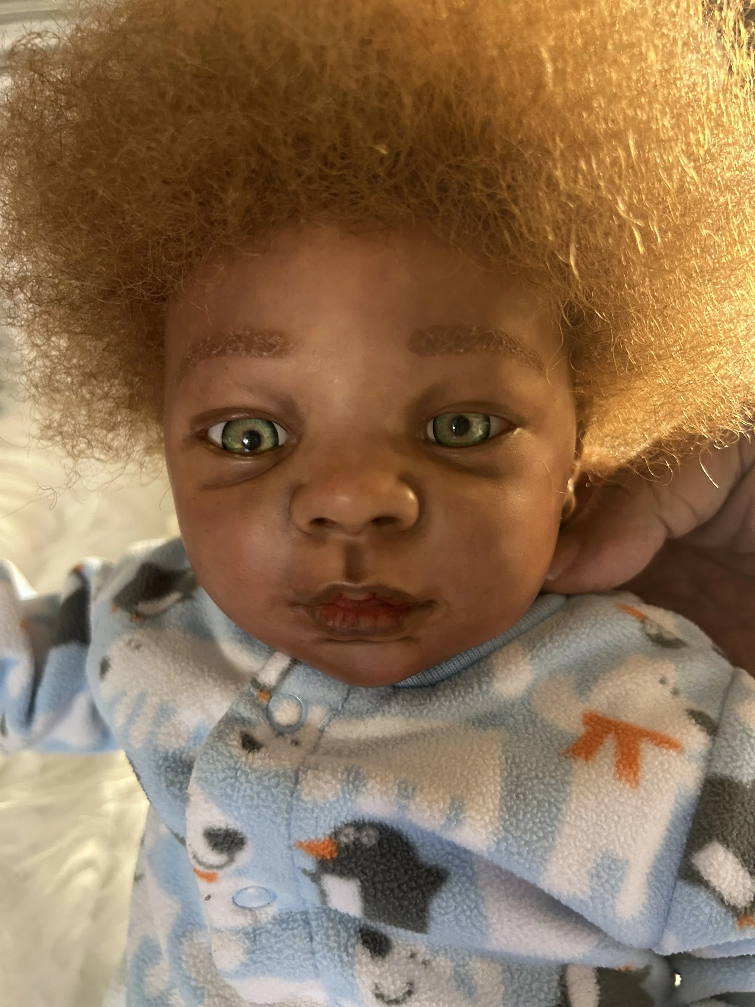 Maicy features beautiful brown skin and sandy brown hair, and she has beautiful blue glass eyes. She has a cloth body and should not be placed in water. It’s important to mention that she is not anatomically correct and can be perceived as either male or female, depending on your perspective. Her arms, legs, and head are made of vinyl and painted with Golden Air-Dry Acrylic Paint. She weighs 4 lbs. 8.2 oz and measures 17 inches in length, fitting into clothes designed for large preemies or small newborns. However, I have not found suitable shoes for her; no shoes will be included with your purchase.